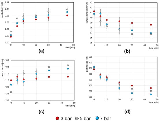 Analysis of the changes in physicochemical properties of the medium in investigated variants (Table 3) may facilitate the interpretation of the HC results. Figure 3 presents the influence of inlet pressure and time of HC on the properties of the SCG and MW mixture, including conductivity, surface tension, zeta potential and particle size. The results in Figure 3a show that the conductivity of the samples increases slightly along with time, which means that some ionic compounds are released during HC. These substances are probably mainly anionic in nature, as the pH of the systems also increases with time (Table 3). As far as the inlet pressure is analysed, the observed differences are relatively small. However, when the system is set at an inlet pressure of 5 bar, the conductivity values appear to be the highest. Figure 3b presents the influence of the inlet pressure and the HC time on the surface tension of the analysed variants. According to the literature, coffee beans contain coffee oil, which has surface active properties []. Biochemical analysis of this compound confirmed the presence of polar groups (chlorogenic acid, an ester of caffeic acid and quinic acid—hydrophilic head) and non-polar groups (hydrocarbon chain—hydrophobic tail), which confer surface activity on coffee oil. It appears that this oil is released during the cavitation processes under all inlet pressures studied, but the release is the greatest under 5 bar and the smallest under 3 bar. As can be seen, the zeta potential of the investigated samples changes insignificantly with the time of HC for the system under 3 bar of pressure (Figure 3c). This potential occurs in the double layer at the surface of the dispersed particles. It is determined at the slipping plane, in relation to the potential deep within the continuous phase. In other words, it is the potential between the dispersant and the fluid layer attached to the particle surface. This parameter is very important in determining the stability of the system and indicating what types of instabilities may occur for a given solid–liquid system. Some small changes in the zeta potential can be seen at 7 bar and the largest for the system under 5 bar. In the latter two systems, a small increase in the zeta potential can be observed, but the values are still negative, which means that this type of charge dominates in the slipping plane []. Moreover, the values of the measured zeta potentials allow us to conclude that the HC process causes a slight decrease in the stability of the tested systems (with time the values are closer to zero). On the basis of the changes in particle size (Figure 3d), which are associated with the changes in inlet pressure and time, it can be seen that the higher the inlet pressure and the longer the treatment time, the smaller the particles. The HC process breaks down the solid particles present in the system into smaller ones. The higher the pressure accompanying the HC process, the smaller the particles obtained which is in agreement with the literature [].