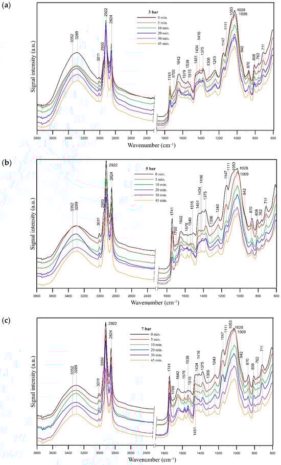 FT-IR/ATR spectra of initial SCGs and SCGs subjected to hydrodynamic cavitation under three pressures: (a) 3 bar, (b) 5 bar, (c) 7 bar, collected after 0, 5, 10, 20, 30 and 45 min. Spectra were displaced vertically in order to avoid overlap.
