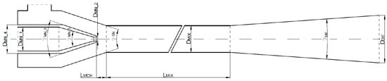 The object of the research is a liquid-driven, subsonic two-phase spray-ejector condenser, presented in Figure 1 (AGH in Kraków) []. Detailed dimensions are presented in Table 1.