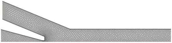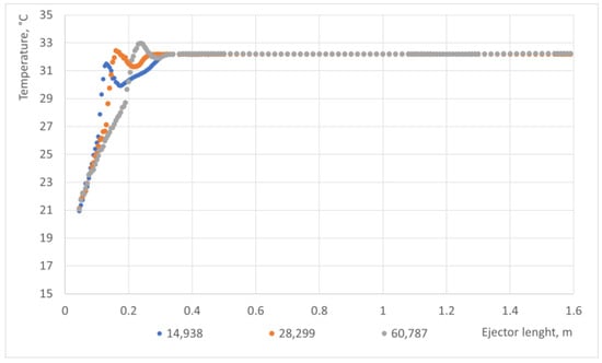 The 2D axisymmetric geometrical model of the two-phase ejector condenser was developed based on the dimensions presented in Table 1. The mesh-independent study presented in Figure 2 was conducted based on the cross-sectional mass-averaged temperature along the flow path for three different meshes with the following number of elements: 14,938, 28,299, and 60,787. There were differences between the temperatures at the beginning, but the achieved mixture temperature in the mixing chamber and at the ejector outlet was the same for all the considered meshes. Taking into account the results from the considered analysis as well as residual values, oscillations, and computational time, the mesh with 28,299 elements was selected. The selected mesh is presented in Figure 3. The base size was 1.25 mm. The inflation layer was applied: three inflation layers with a 1.6 stretching factor.