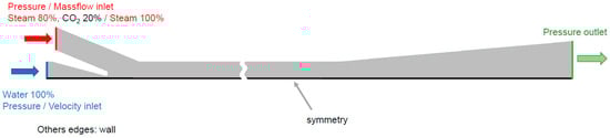 The general scheme of the boundary conditions for the 2D axisymmetric model is presented in Figure 4. Various boundary conditions (mass flow, velocity, pressure) at water and gas inlets were investigated. The detailed values at the boundary surfaces are presented in Table 2. Pressure outlet boundary conditions were applied at the ejector outlet. The impact of the inlet gas pressure and CO2 presence was analyzed to investigate the ejector performance using developed models. Constant properties of steam and CO2 were assumed based on the IAPWS-IF97 [] tables and NIST Chemistry WebBook [], respectively.