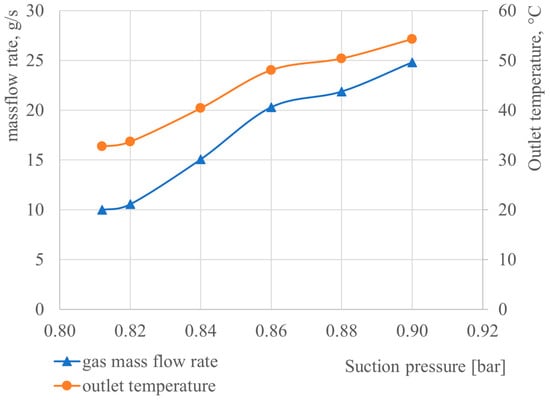 The influence of the suction pressure (0.812, 0.82, 0.84, 0.86, 0.88, 0.90) on the ejector performance is presented in this section. The results for the basic operation mode (0.9 bar) are presented in Table 4. The assumed motive water pressure was 12 bar. The steam was fully condensed (no steam at the outlet). The mass flow rate of the gas at the inlet and the mass-average outlet temperature of the mixture as a function of the suction pressure are presented in Figure 5. A lower sucked-in mass flow rate of gas and a lower outlet temperature can be observed for a lower suction pressure. For a gas inlet pressure equal to 0.813 bar, a 10 g/s gas mass flow rate is achieved. The highest value mass flow rate of 25 g/s was achieved for a gas inlet pressure of 0.9 bar. The outlet temperature varied from 33 °C to 54 °C as a function of the suction pressure.