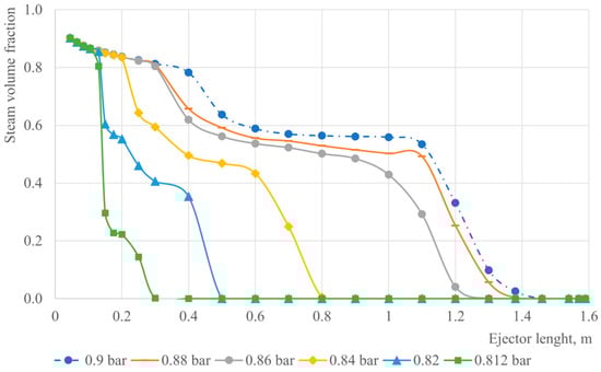 Steam volume fraction charts along the flow path for various gas inlet pressures are presented in Figure 6. The steam volume fraction decreases along the length of the ejector for all the considered cases. If the inlet gas pressure decreases, the steam volume fraction decreases faster along the length.