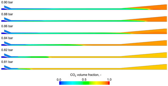 Figure 7 shows the CO2 distribution for various gas inlet pressures. The CO2 volume fraction contour varies mainly along the flow path. The lower the suction pressure, the more rapid the growth of the CO2 volume content due to a more intensive condensation phenomenon. The highest concentration is about 0.7–0.8, located in the diffuser part.