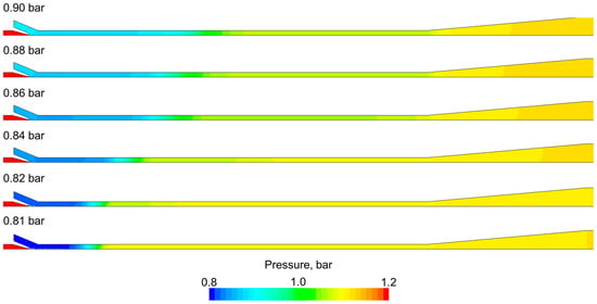 The pressure distribution for various gas inlet pressures is presented in Figure 8. The sub-pressure region can be observed at the suction chamber and at the beginning of the mixing chamber. The level of the sub-pressure and its range depend on the assumed gas inlet pressure. The pressure changes along the flow path, but small pressure disturbances in the radial direction are located in the water jet region.