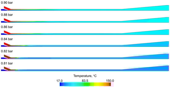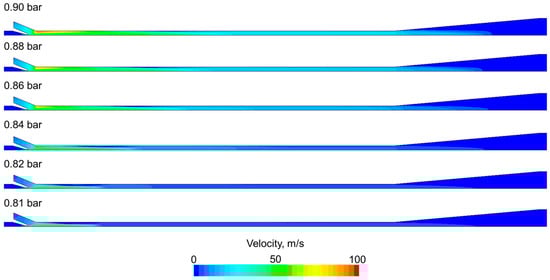 Figure 9 presents the velocity scalar field for various gas inlet pressures. The higher the gas inlet pressure, the higher the mixture velocity. The mixture velocity is about 50 m/s at the beginning of the mixing chamber and gradually decreases along the flow path due to the steam volume fraction reduction. The greatest value of the velocity can be observed at the beginning of the mixing chamber, where two streams meet: nearly 100 m/s for the 0.9 bar gas inlet pressure.