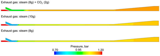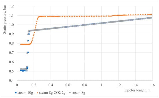 In this section, three cases are considered (10 g steam, 8 g steam, 8 g steam + 2 g CO2). The assumed velocity at the motive water inlet is 0.67 m/s. Cross-sectional average static pressure charts for the considered cases are presented in Figure 11. For the mixture of steam (8 g) and CO2 (2 g), the inlet gas pressure is about 0.8 bar, whereas for the pure steam cases (10 g and 8 g). it is above 0.5 bar. The most significant pressure growth occurs in the first part of the ejector (to 0.3 m of ejector length). Figure 12 shows the pressure distribution for various gas streams. The pressure distributions for the pure steam cases are similar. Moreover, for those cases, the pressure is changing also in the radial direction in the region of the water jet, where fluctuation occurs.
