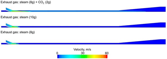 Considering the velocity distribution presented in Figure 13, a higher mixture velocity is observed for the case with CO2. CO2 is present even after condensation and significantly increases the specific volume of the mixture, which directly influences the mixture velocity. The maximum velocity is about 60 m/s in the water jet region, which is far from the speed sound.