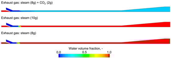 Figure 14 shows the temperature distribution for the considered various gas streams. The average temperature for the exhaust gas with CO2 is lower than the pure cases, which is caused by the heat capacity of CO2 The temperature is becoming uniform very quickly and does not change along the flow path, which indicates that all the steam is condensed rapidly. This observation is confirmed by Figure 15, which shows the water volume fraction distribution. For the pure steam cases (10 g and 8 g steam), the water fills the entire domain, whereas for the mixture of steam and CO2, the water volume fraction is about 0.2. The steam is fully condensed in all cases; therefore, the difference is due to the presence of CO2, which occupies the domain after condensation.