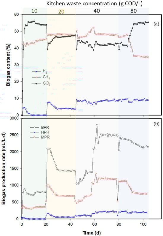 Regarding the methane production under steady-state conditions, it gradually increased as the KW concentration increased from 10 to 40 g COD/L with constant methane content of 44.7–48.1% but reduced to 36.5% at an 80 g COD/L KW concentration. The daily biohythane production yield exhibited a similar increasing trend at KW 10 to 40 g COD/L. The biohythane production was 2481 ± 101 mL/day at KW 40 g COD/L. On the other hand, methane yields were constant at around 10 mL/g COD at KW 40 g COD/L and afterward decreased to 4.7 ± 0.3 mL/g COD at KW 80 g COD/L (Table 2). In this case, the biohythane production decreased to 2183 ± 92 mL/day, which was 13% lower than the value of 2481 ± 101 mL/day at KW 40 g COD/L. This might result from the bioreactor maintaining the operating pH. Using KW at 80 g COD/L as feedstock, the alkaline solution volume pumped into the ITR reactor was equal that of the inflow substrate, which possibly led to a sludge biomass dilution and then caused a wash-out phenomenon. At KW 40 g COD/L, both the MPR and the methane content were at their highest values among the tested KW concentrations. Therefore, it is concluded that KW 40 g COD/L (OLR 20 g COD/L-day) was the optimal substrate concentration for giving peak methane production and biohydrogen production.