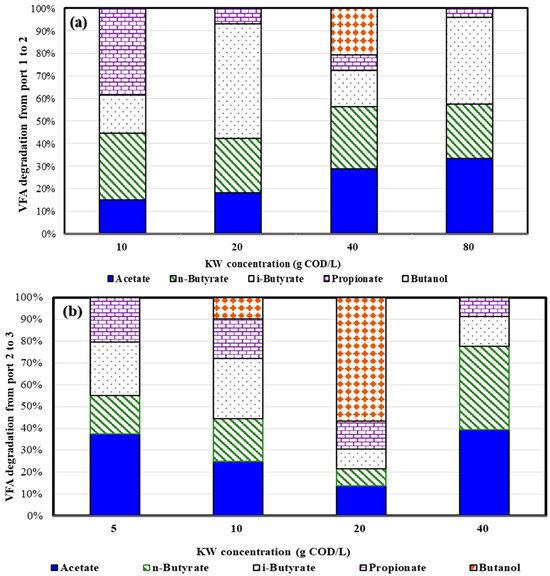 VFA degradation using various kitchen waste (KW) concentrations at sampling ports (a) 2 and (b) 3.