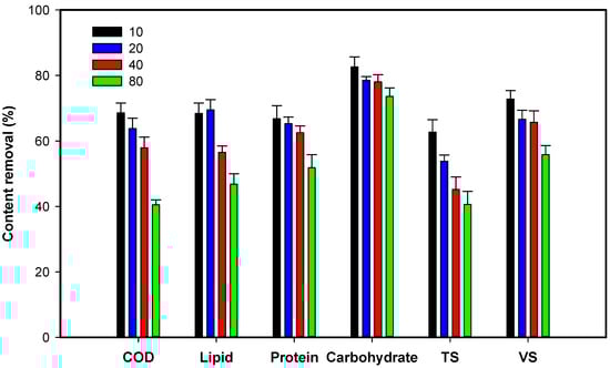 Figure 4 also shows that the KW concentration may affect the removal efficiencies of COD, carbohydrates, lipids, and protein. They were somehow dependent on the KW concentration, with two KW concentration groups of 10–20 g COD/L and 40–80 g COD/L. For the KW concentrations of 10–20 g COD/L, the content removal was more efficient than for the latter due to lower microorganism concentrations at low concentration of suspended solids. Similar removal efficiency levels were obtained for TS (53.8–62.6%), VS (66.8–72.8%), COD (63.8–68.7%), lipids (68.4–69.4%), protein (65.3–66.7%), and carbohydrates (78.8–82.5%). The content removal was less efficient than for other groups due to the high KW concentrations inhibiting the microorganisms. These removal efficiencies decreased slightly, with COD being removed at a rate of 40.5–57.9%, lipids at 46.8–56.4%, protein at 51.5–62.6%, and carbohydrates at 73.5–78.1%, while TS and VS slightly decreased, with values of 40.3–45.2% and 55.7–65.5%, respectively.