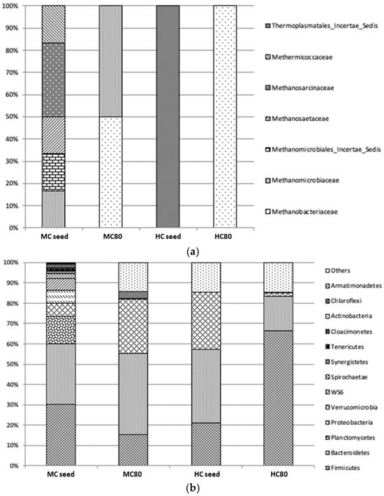 Taxonomy profile compositions: (a) the archaea at the family level and (b) the bacterial consortia at the phylum level (HC seed, the hydrogen chamber seed inoculum; HC80, the hydrogen chamber at a KW concentration of 80 g COD/L; MC seed, the methane chamber seed inoculum; MC 80: the methane chamber at a KW concentration of 80 g COD/L).
