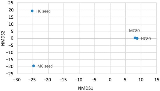 Beta diversity using non-metric multidimensional scaling (NMDS) analysis of microbial community data for four samples (HC seed, hydrogen chamber seed inoculum; HC80, the hydrogen chamber at a KW concentration of 80 g COD/L; MC seed, the methane chamber seed inoculum; MC80: the methane chamber at a KW concentration of 80 g COD/L).