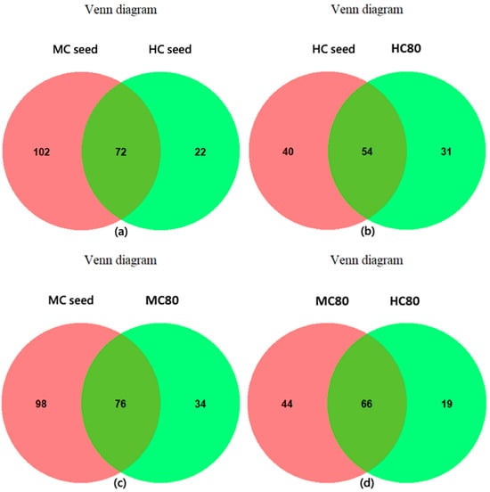 Family-level Venn diagram. The number at left indicates the amount of family type only in the methane chamber. This intersection was both in the methane and hydrogen chambers. The right one indicates the amount of family type only in the hydrogen chamber (HC seed, the hydrogen chamber seed inoculum; HC80, the hydrogen chamber at a KW concentration of 80 g COD/L; MC seed, the methane chamber seed inoculum; MC80: the methane chamber at a KW concentration of 80 g COD/L). (a) intersection of MC seed and HC seed, (b) HC seed and HC80, (c) MC seed and MC80, and (d) MC80 and HC80.