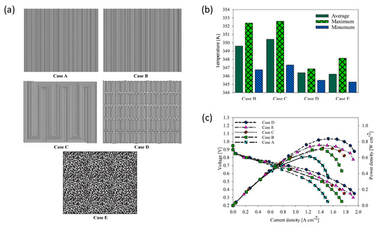 (a) Five different cooling flow-field designs: straight parallel channels (case A), straight parallel channels filled with metal foam (Case B), multi-channel serpentine (Case C), novel serpentine channels (Case D) and integrated metal foam (Case E); (b) average temperature (membrane), maximum and minimum temperature of the cathode catalyst layer and (c) comparison of the polarization curve and power density curves for the various fuel cells [106]. Reproduced with permission from Elsevier.
