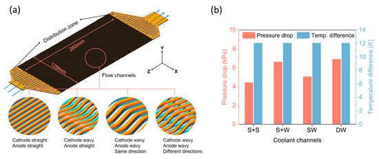 (a) Computational domains of four configurations of coolant channel of a large-size proton exchange membrane fuel cell including straight + straight (S + S), straight + wavy (S + W), same waveform (SW) and different waveform (DW) channels and (b) pressure drops and temperature differences of the four configurations [116]. Reproduced with permission from Elsevier.
