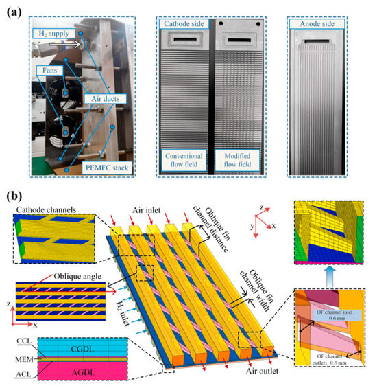 (a) Photos of the air-cooled PEMFC of the experimental test system and BPs and (b) schematic diagram of the computational domain and meshing details in numerical simulations [119]. Reproduced with permission from Elsevier.