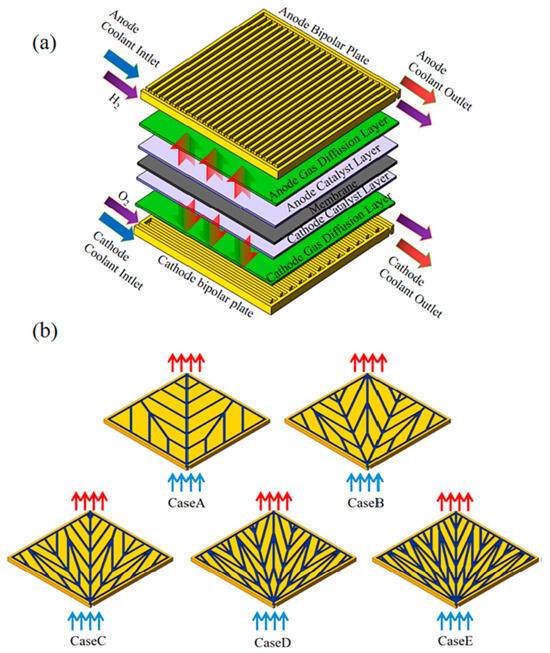 Fuel cell geometry: (a) schematic diagram of the PEMFC and (b) tree-shaped fractal cooling flow field [121]. Reproduced with permission from Elsevier.