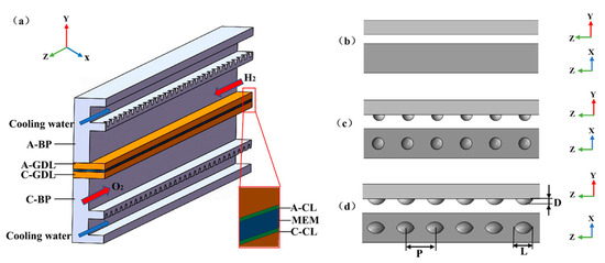 (a) PEMFC model; (b) smooth cooling channel; (c) circular dimpled cooling channel and (d) elliptical dimple cooling channel [123]. Reproduced with permission from Elsevier.