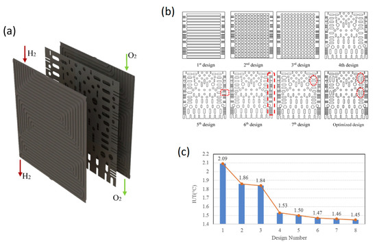 Rahimi-Esbo et al. [127] conducted a numerical study on a serpentine design for the reactant flow field of a PEMFC, incorporating a spacer plate between the bipolar plates (Figure 6a). They evaluated several configurations, progressing from an initial design without a spacer to an optimized geometry (design 8) by adjusting the placement and number of spacers (Figure 6b). The results indicated that, in the absence of a spacer, cooling fluid tended to become trapped in some regions of the bipolar plate. Therefore, they used, at first, a simple spacer with parallel rectangular holes (design 1). They observed high contact resistance for this design with an IUT of 2.09 °C and an average temperature of 73.88 °C. They then iteratively refined the design by analyzing the IUT (Figure 6c) and temperature contour on the spacer surface at each step to reach the lowest IUT (1.45 °C) with their optimized design.