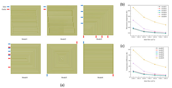 (a) Design scheme of flow field. Effect of inlet flow on heat transfer characteristics; (b) maximum temperature and (c) temperature difference [114]. Reproduced with permission from Elsevier.
