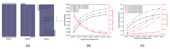 (a) Three coolant flow-field designs for large-scale PEMFCs; (b) average cathode liquid saturation and index of uniform temperature profile for the PEMFC under different cooling water inlet volume flow rates; and (c) average current density profile and pumping power profile under different coolant volume flow rates [115]. Reproduced with permission from Elsevier.