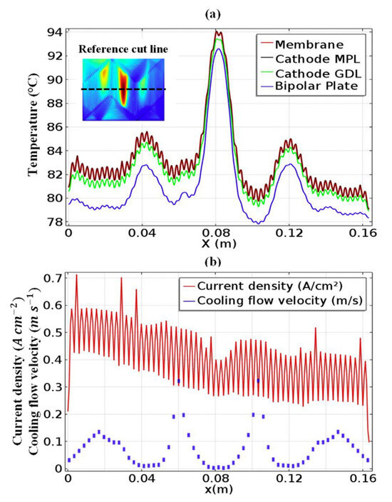 (a) Temperature distribution at the reference cut line in the membrane, cathode microporous layer, cathode gas diffusion layer and bipolar plate for a current density of 0.42 A cm−2 and (b) current density and cooling flow velocity at the cut line [129]. Reproduced with permission from Elsevier.