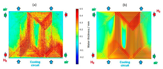 (a) Measured and (b) simulated total liquid water thickness for a stack of 5 cells for a current density of 0.25 A cm−2 and for an inlet cooling water temperature of 64 °C [69]. Reproduced with permission from Elsevier.