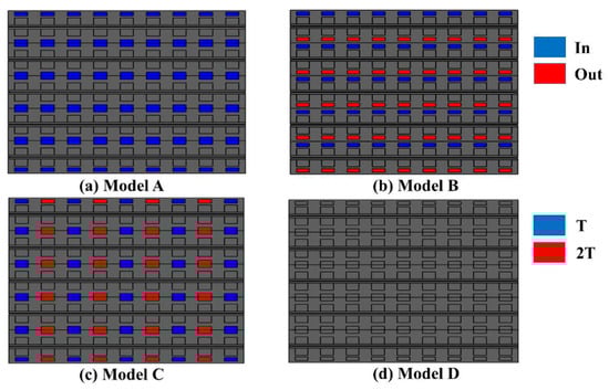 Cooling schemes of each model: (a) traditional unidirectional cooling flow (Model A); (b) reverse flow cooling of the interlayer flow channel (Model B); (c) reverse flow cooling of the adjacent channel (Model C;) and (d) bidirectional circulation cooling (Model D) [130]. Reproduced with permission from Elsevier.