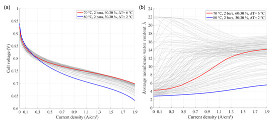 (a) I–V curves and (b) averaged water content obtained for the 108 simulations with the calibrated spatially averaged P3D model featuring a variation in coolant outlet temperature (60 °C, 70 °C and 80 °C), in coolant temperature gradient between inlet and outlet ΔT (2 °C, 6 °C, 10 °C and 20 °C) and in anode and cathode RH (30%, 50% and 60%). The best (red) and the worst (blue) performances at high current density have been highlighted.