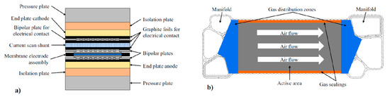 Example of single cell hardware using real bipolar plates and current scan sensor: (a) sectional view of the cell and (b) air side of the bipolar plate. The airflow direction in the straight channels is indicated by white arrows [138]. Reproduced with permission from Elsevier.