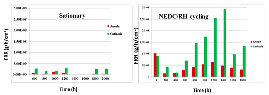 To delve further into the understanding of the coolant flow effect, Nandjou et al. [67] proposed an accelerated stress test based on the standard Fuel Cell Dynamic Load Profile derived from New European Driving Cycle in the frame of the FCH-JU 303445 StackTest project [154]. This incorporated a variation in relative humidity in addition to a variation in current in order to consider the reduced efficiency of high-power humidifiers. The stack used for the durability test presented serpentine flow fields at the anode and cathode. Post-mortem analyses of the aged membrane–electrode assemblies and bipolar plates were conducted at the end-of-life. The experimental findings were then compared with the simulated temperature, humidity, and membrane water content within the cell. In this study, a detailed analysis of the influence of local temperature and humidity on PEMFCs’ degradations was performed. The tests carried out, in the absence of start-up and shut-down phases, correspond to stresses on the cell that do not favour carbon corrosion or loss of active surface area. Detailed observation of the corrosion on the stamped metallic bipolar plates was performed. The location of the corrosion marks was recorded for all the bipolar plates and a statistical analysis was carried out. This provided the most frequent location of corrosion marks on the active surface. For the anode, these coincided with the areas of highest temperature on the active surface. For the cathode, they coincided with the areas where the humidity in the cathode channels was highest, according to the results of the pseudo-3D model. The measurement of fluorine in the effluent, as the test progresses, provided an indicator of chemical attack on the membrane [155]. There was a major difference between the steady-state and dynamic tests. Indeed, the fluoride release was around ten times greater in the dynamic test, indicating greater degradation of the membrane material (Figure 14). As a result of ageing, structural degradation of the membrane occurred in certain well-defined areas of the active surface. The SEM observation showed that this was delamination of the material. The defects were located mainly in front of the rib, as shown by microscopic observation. Both the anode and cathode designs were visible, with the cathode predominating.
