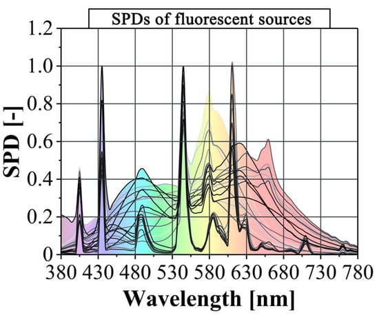 A set of typical relative SPDs of typical fluorescent lamps according to CIE [31].
