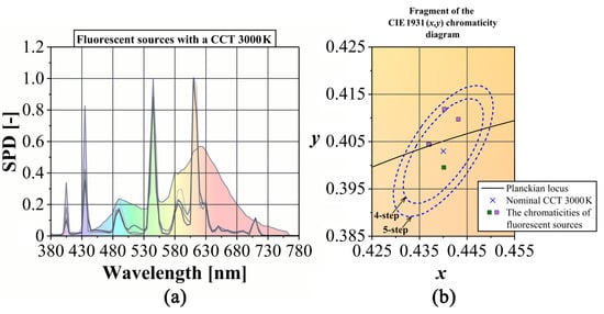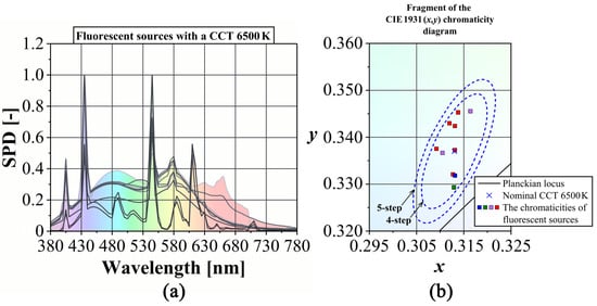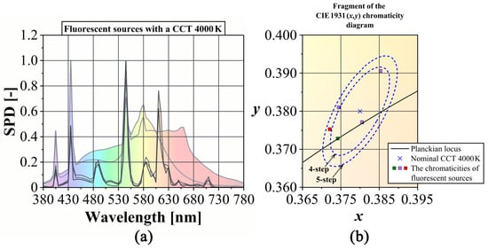 A summary of (a) the relative spectral power distributions (the data were derived from the CIE 015:2018 document [31]) describing typical neutral white fluorescent lamps (CCT 4000 K), with (b) their chromaticities marked as squares with different colors representing the different classes of color preference: green represents FL belonging to the P2 class, violet is for the P3 class, and red stands for out of class.