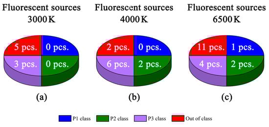 A summary of typical white fluorescent lamps with nominal CCT of (a) 3000 K, (b) 4000 K, and (c) 6500 K. CPC classes are represented with different colors: blue represents the P1 class, green represents FL belonging to the P2 class, violet is for the P3 class, and red stands for out of class.