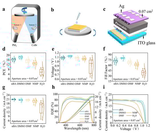 The perovskite films were fabricated using a two-step evaporation–spin coating method. As depicted in Figure 1a, the inorganic precursor films were prepared by dual-source co-evaporation of two inorganic salts in the first step (PbI2 and CsBr, PbI2 dominantly, hereafter referred to as PbI2). Subsequently, the second step involved spin-coating the organic salt in nBA solution (Figure 1b), followed by annealing in air without the protective environment of an inert atmosphere. However, nBA, utilized as the organic salt solvent, exhibits a relatively low dielectric constant (17.8) and polarity. While these properties are advantageous in mitigating the adverse effects of ambient moisture on perovskite crystallization during the second step [], the limited permeability of nBA restricts the rapid diffusion of organic salts through the precursor layer. This results in incomplete reactions between the inorganic precursor and the organic salts. To address this limitation, several polar solvents, including dimethyl sulfoxide (DMSO), dimethylformamide (DMF), N-methylpyrrolidone (NMP), and water (H2O), were explored as additives to nBA to enhance the solvent’s permeability. The resulting perovskite films were then integrated into single-junction solar cells with an architecture of Glass/ITO/SAM/perovskite(1.66eV)/LiF/C60/BCP/Ag. The schematic structure is presented in Figure 1c, and the detailed photovoltaic parameters of the devices with an active area of 0.07 cm2 using nBA, the mixed solvent of nBA with DMSO, DMF, NMP, and H2O, are summarized in Figure 1d–i.