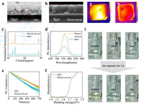 Characterization of perovskite films fabricated by different solvents. (a,b) Cross-sectional SEM images. (c) XRD patterns of perovskite films. (d) PL spectra of perovskite films. (e) Time-resolved PL transients of perovskite films. (f) Tauc plots of perovskite films. (g,h) PL mapping of perovskite films with a 1.5 cm × 1.5 cm active area. (i) The image of organic salts dissolved in different solvents after being exposed to air for 1 h.