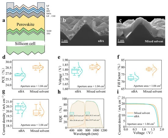 The device characterization of fully textured perovskite/silicon tandem solar cells. (a) Schematic of the perovskite/silicon tandem solar cell. (b,c) Cross-sectional SEM images of the perovskite/silicon tandem for nBA and mixed-solvent devices with an average pyramid size of 2–3 μm. (d–g) Photovoltaic parameters for the tandem devices. (h) EQE spectra of current-matched fully textured perovskite/silicon tandem cells. (i) J–V curves of the tandem devices (1.04 cm2 aperture area).