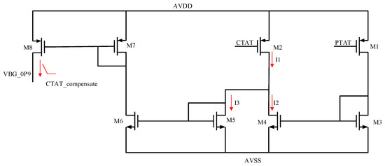 The low-temperature CTAT compensation circuit is shown in Figure 3. In this circuit, the M1 and M2 transistors replicate the CTAT and PTAT currents, respectively, generated in Figure 2, through the current mirror relationship. The current in the saturation region of the MOS transistor is given by the following equation:
