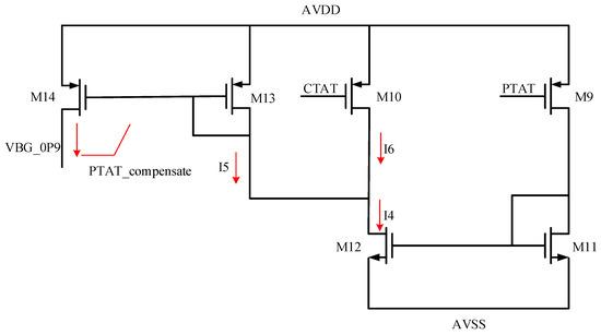 Since I4 is a current with a positive temperature coefficient and I6 is a current with a negative temperature coefficient, I4 will be greater than I6 only at high temperatures. This condition allows current to flow through M13, and the high-temperature PTAT compensation current is generated through the replication of M14’s current mirror.
