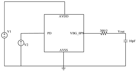 In this section, we will analyze the key data pertaining to the proposed reference voltage circuit. As shown in Figure 5, the experimental verification schematic diagram includes several key components: AVDD, which is the analog voltage domain supplied by the V1 voltage source providing a 1.8 V voltage; PD, the switching input for the entire reference voltage circuit, where a low level turns it on, and a high level turns it off, provided by the V2 voltage source; and AVSS, the analog ground, which is connected to a low signal voltage. The VBG_0P9 generates the output voltage Vout through an RC filter. To verify the accuracy of the reference voltage circuit at various temperatures, the output voltage Vout is measured at different temperatures to assess the overall voltage accuracy.