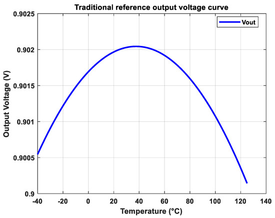 According to Formula (11), the parts per million (PPM) [23,24] of the traditional reference voltage circuit is calculated to be 12.78. This reference voltage deviation arises from the loss of negative temperature coefficient curvature, which impacts measurement accuracy and system stability. The curvature compensation circuit structure proposed in this paper effectively addresses this loss, enabling the realization of a high-precision reference voltage generation circuit. By correcting the curvature across varying temperatures, this innovative design significantly improves voltage accuracy, making it well-suited for modern applications that demand enhanced reliability and performance.