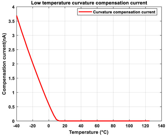 The curvature compensation circuits depicted in Figure 3 and Figure 4 are designed to achieve segmented temperature compensation, addressing the unique challenges posed by varying temperature conditions. At low temperatures, the circuit compensates for the loss of curvature by utilizing the complementary to absolute temperature (CTAT) current. This approach effectively corrects inaccuracies that may arise in voltage reference outputs under cold conditions. Conversely, at high temperatures, the proportional to absolute temperature (PTAT) current is employed to mitigate deviations that occur in the high temperature range.