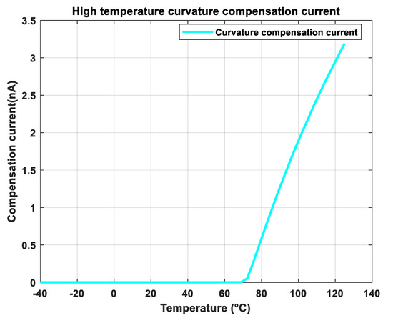 Figure 8 presents the high-temperature compensation current output curve for the circuit depicted in Figure 4. It is evident that the traditional reference voltage experiences an increase in the negative temperature coefficient at elevated temperatures, leading to the output voltage curve exhibiting characteristics of negative temperature coefficient change. To effectively address this curvature loss, a positive temperature coefficient current is introduced at high temperatures. This compensatory current is essential for restoring voltage accuracy, ensuring that the reference voltage remains stable even under high-temperature conditions. By dynamically adjusting the output based on temperature fluctuations, this approach significantly enhances the reliability and performance of the voltage reference circuit. Such improvements are particularly important for applications in harsh environments where precision and stability are critical, ultimately contributing to the overall safety and efficiency of power systems.