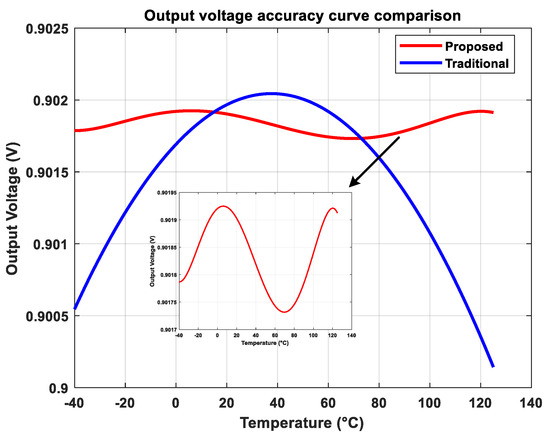 Figure 9 provides a comparison of the output voltages between the proposed reference voltage circuit and a traditional reference voltage circuit. The results clearly indicate that the implementation of the proposed curvature compensation circuit significantly enhances the accuracy of the output voltage. This improvement effectively addresses the curvature loss problem that arises from the temperature coefficient of the negative temperature coefficient current, which varies with temperature. The experimental results demonstrate that the output accuracy of the newly designed curvature compensated reference voltage circuit reaches an impressive level of just 3.34 ppm.