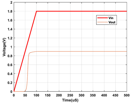 The transient power-on process of the proposed voltage reference circuit is illustrated in Figure 10 below. Here, Vin represents the input voltage of 1.8 V, while Vout denotes the output voltage of the proposed reference circuit. As shown, under typical operating conditions, the circuit achieves a stable output voltage of 0.9 V within 100 µs after Vin is powered on.