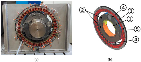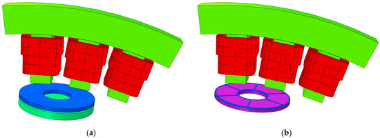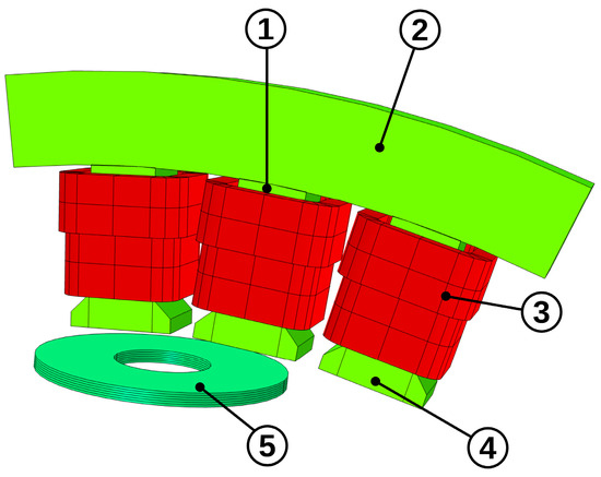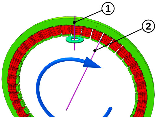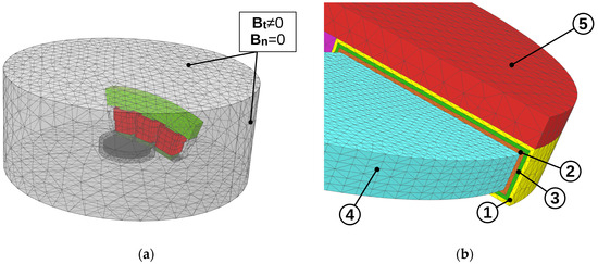 Figure 7b). Opera 3D’s computational algorithm requires the air gap to be divided into three layers: the stationary layer (1), the layer rotating with the drive plate (2), and the gap (3). In the gap (3), the mesh is generated at each time step, while in the other elements it remains unchanged. A boundary condition was assumed on the outer faces of the calculation area, assuming that the magnetic flux density vector has only a tangential component (