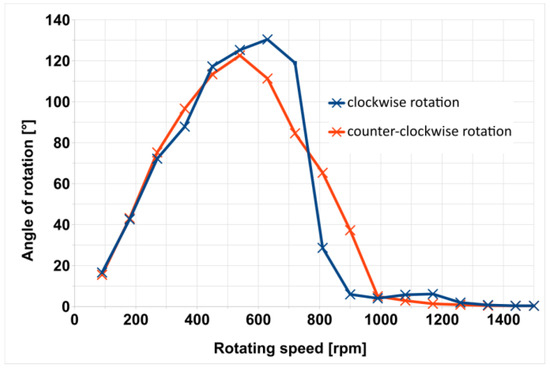 Figure 11b) improves the characteristic rotational speed versus rotation angle for rotational speeds greater than 800 rpm. Thanks to the increased driving torque, the device’s operating range was extended.