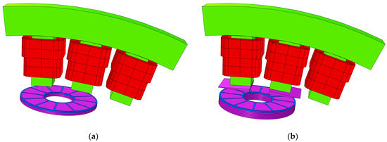 Figure 7a). It was particularly important to prepare the mesh of the air gap between the moving element of the model (the plate) and the stator (